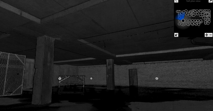 Панорама из облака точек. Вид паркинга изнутри. Кругами отмечены станции съемки.
